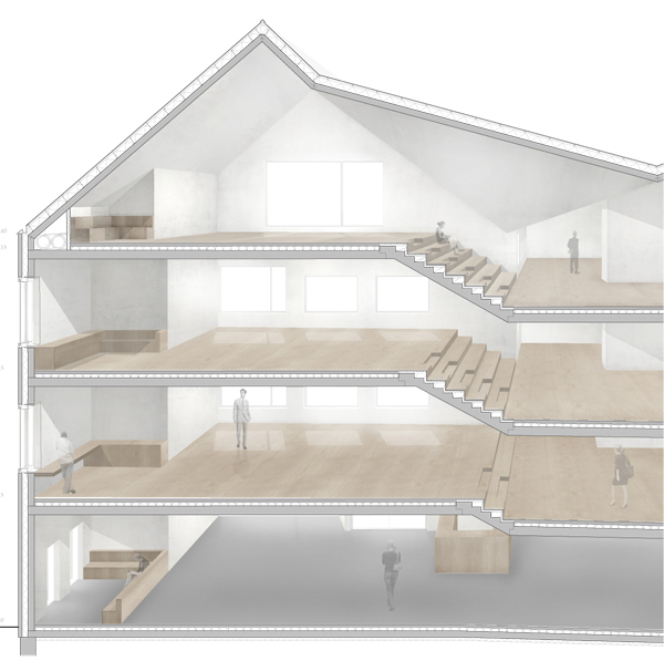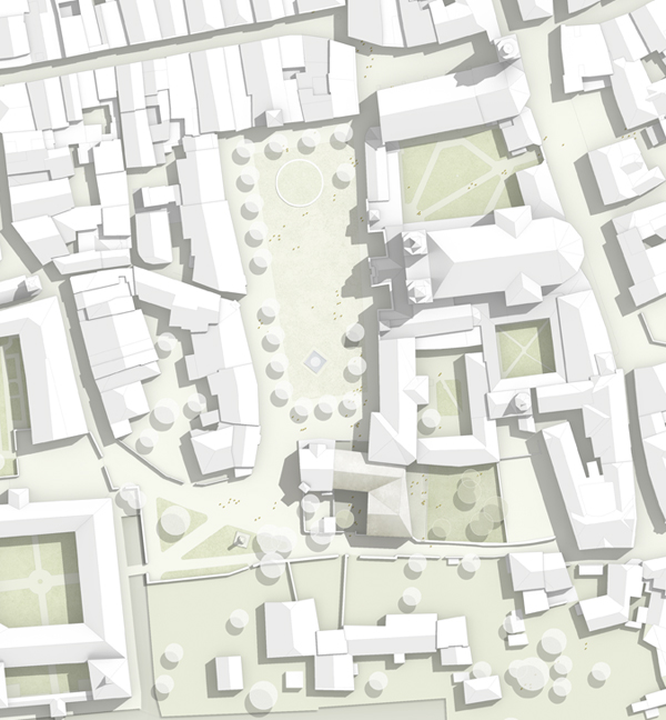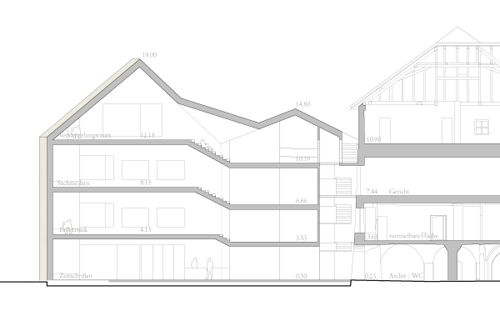 Das Gebäudevolumen leitet sich geometrisch aus dem ehemaligen mittelalterlichen Finanzgebäude im Westen ab; dieses wird zunächst verlängert, verschwenkt sich um180 Grad und bildet mit einem sich erhebenden Ziergiebel einen prägnanten Abschluss. Die Geschossdecken binden nahtlos an die bestehenden an, wobei die neuen Räume über zentrale Sitzstufen eine großzügigere Höhe bekommen und auch vertikal miteinander in Beziehung gebracht werden.
